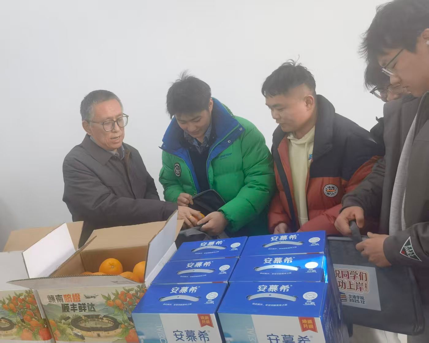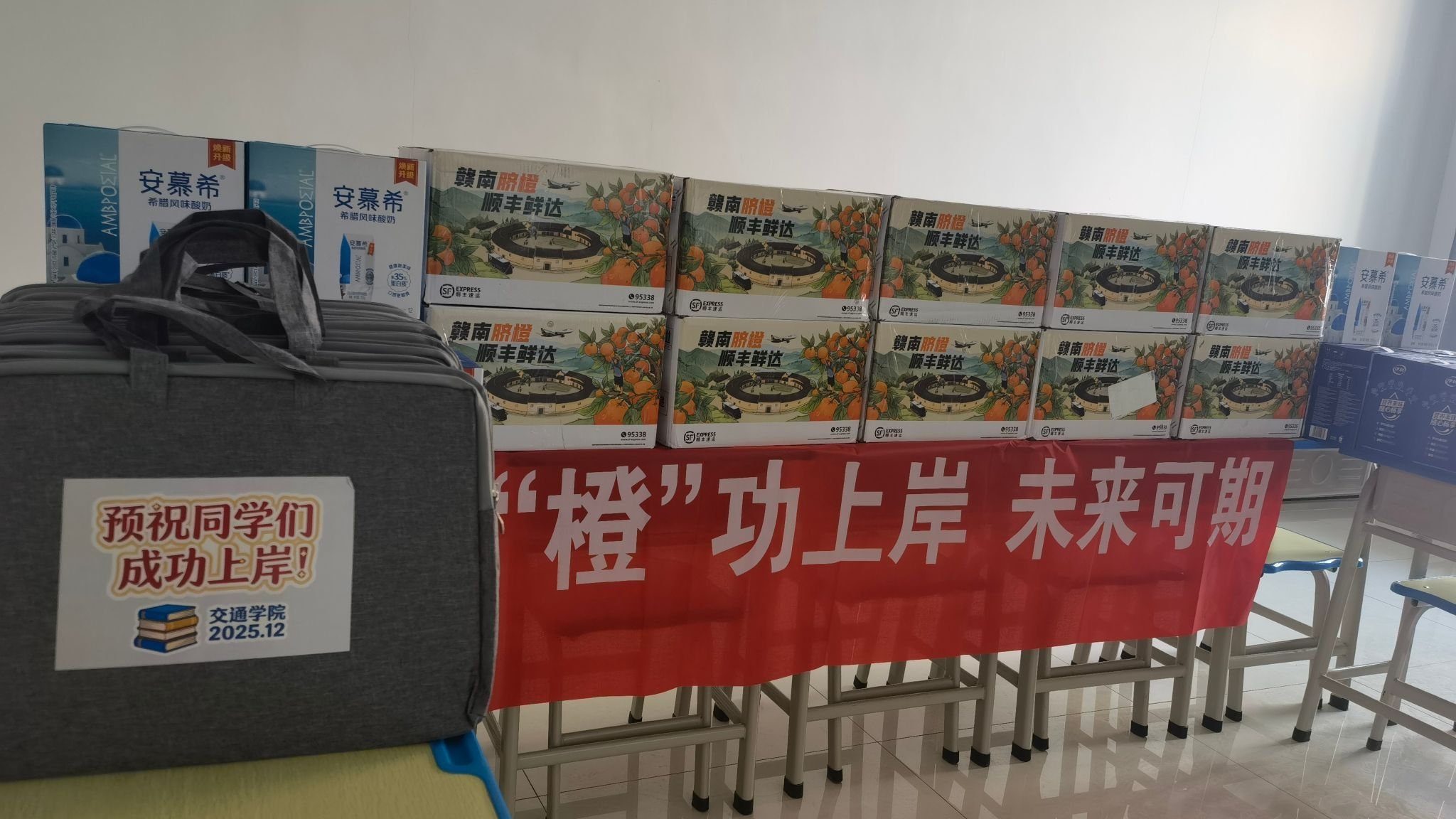 随着全国硕士研究生招生考试进入最后冲刺阶段,交通学院考研学子们迎来了最紧张关键的备考时光。交通学院协调600斤赣南脐橙,祝福他们“‘橙’功上岸 未来可期”,并购置酸奶、文具礼包等慰问品,班子成员于12月8日深入一线走访慰问正在全力备考的学子们,为他们送去冬日的温暖与关怀。