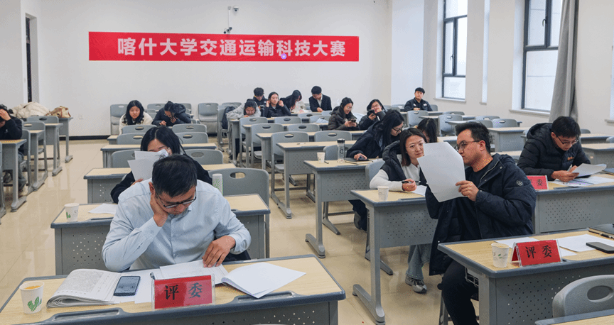 第二十一届全国大学生交通运输科技大赛校内选拔赛暨喀什大学第四届交通运输科技大赛(初赛)于2025年12月12日在喀什大学东楼B203、B204顺利举行,本次初赛由喀什大学交通学院院长刘杰教授、副院长户佐安教授、副院长王宝义教授、黄龙副教授、胡晓莹副教授、交通工程教研室副主任王睿爽老师等老师担任评委,交通学院团委学生会负责会务工作。